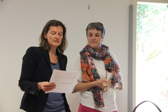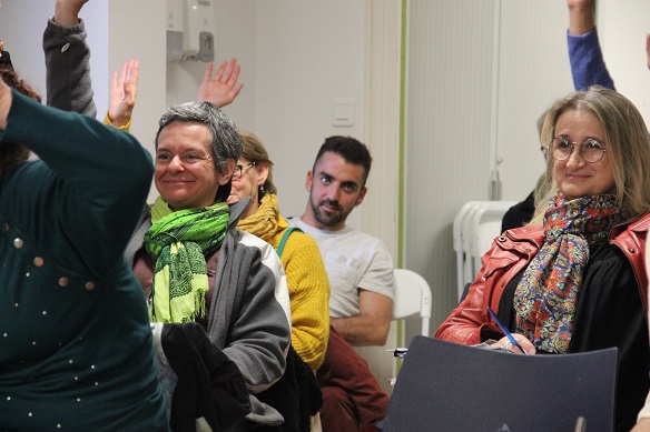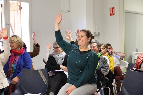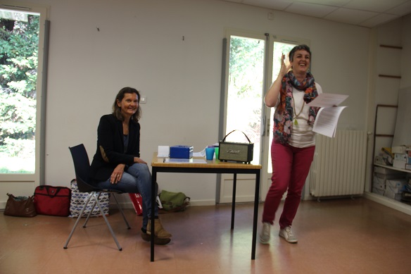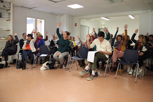 C’est ainsi que nous nous sommes installés dans la salle afin de procéder aux délibérations. L’ordre du jour s’est égrainé en état d’apesanteur. Marion, Nathalie et Véronique ont animé la séance. La charte a été lue, discutée, validée, d’un commun accord. Une étrange chorégraphie a débuté alors : les danseurs, sur leur chaise, ont levé, puis baissé le bras, en même temps, tous ensemble. Mais c’est lorsque les membres du CA se sont présentés que l’atmosphère a changé.